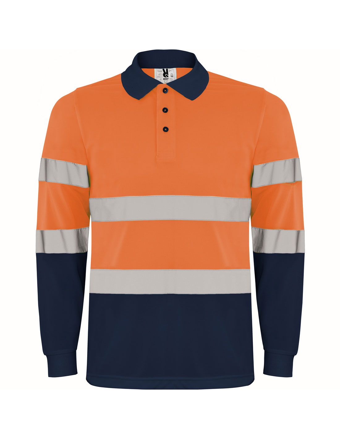 Polo técnico manga larga de alta visibilidad. Con bandas reflectantes y tejido anti enganches. 100% poliéster piqué, 170 g/m².