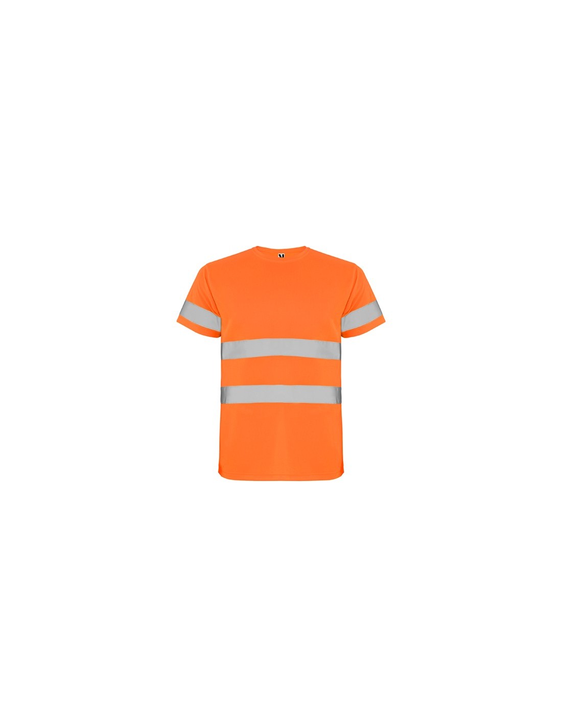 Camiseta técnica de manga corta de alta visibilidad. Cuello redondo en el mismo tejido, con cubrecosturas reforzado en la parte interior del cuello. Dos cintas reflectantes horizontales en torso y una en mangas.