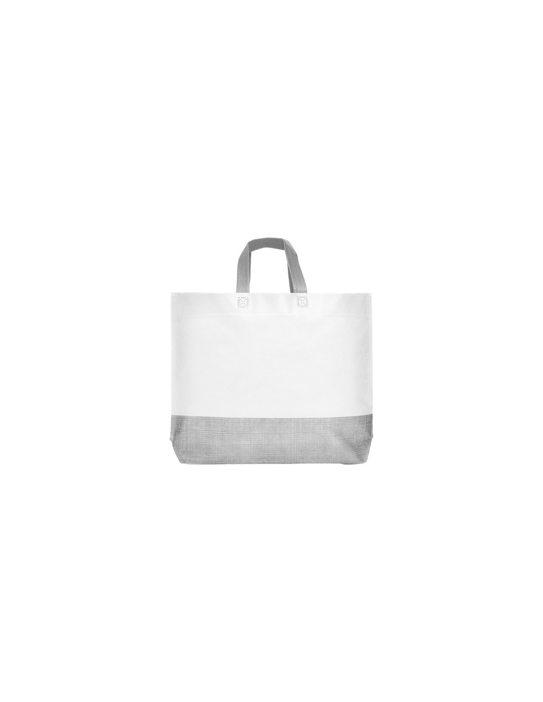 Bolsa termosellada con fuelle hexagonal en la base, fabricada en tejido non woven (no tejido), en color combinado, con asa corta de cinta en color negro.