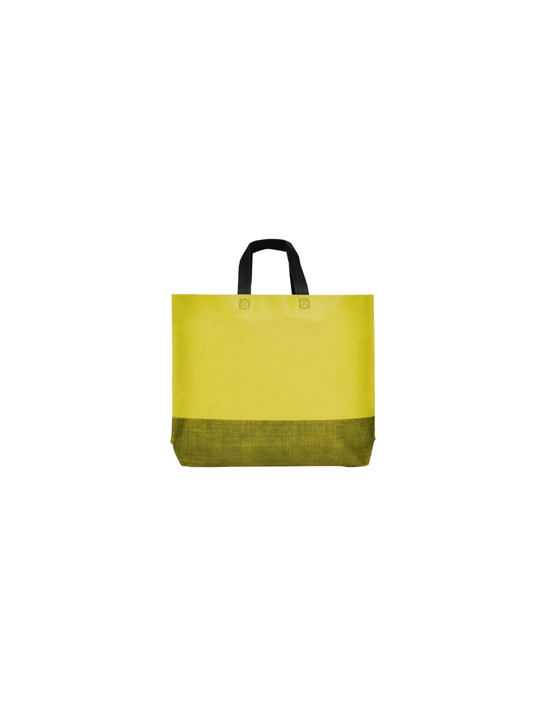 Bolsa termosellada con fuelle hexagonal en la base, fabricada en tejido non woven (no tejido), en color combinado, con asa corta de cinta en color negro.