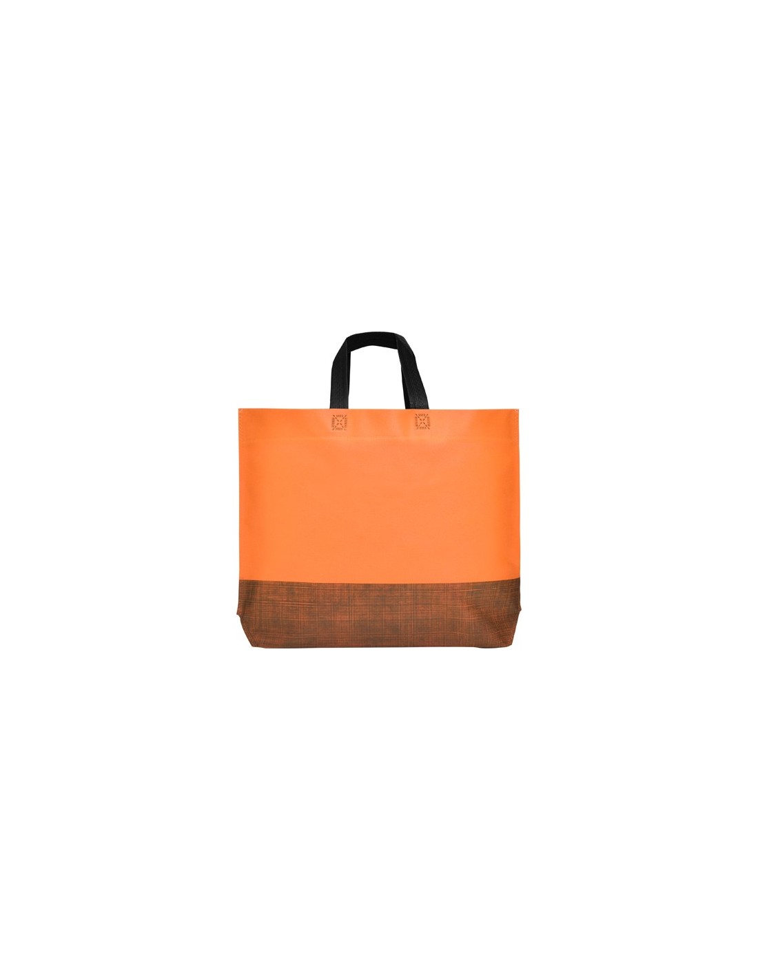 Bolsa termosellada con fuelle hexagonal en la base, fabricada en tejido non woven (no tejido), en color combinado, con asa corta de cinta en color negro.