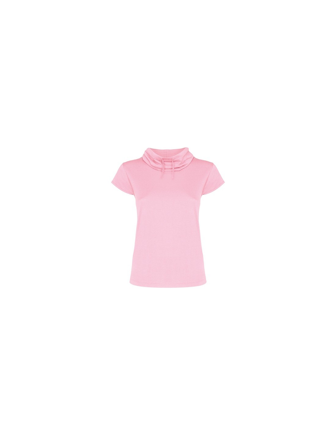 Camiseta manga corta, escote amplio de base y cuello chimenea con ajuste de cordón. Costuras laterales y talle con forma.