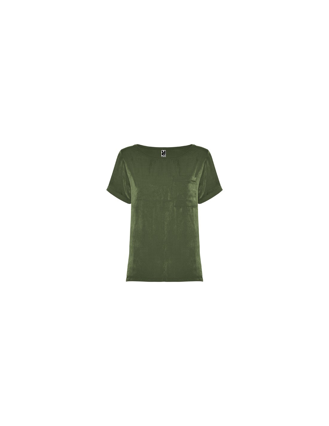 Camiseta de mujer de manga corta y escote amplio. Bolsillo en pecho izquierdo. El patronaje de la espalda es ligeramente más largo que el delantero, con aperturas laterales en el bajo.