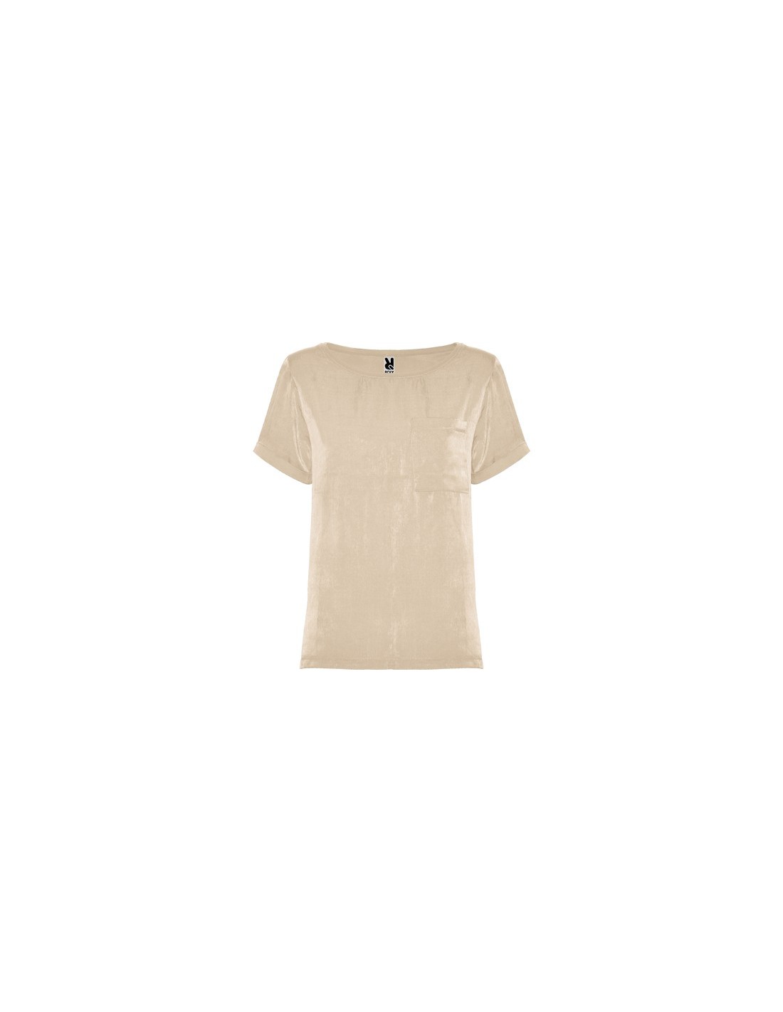 Camiseta de mujer de manga corta y escote amplio. Bolsillo en pecho izquierdo. El patronaje de la espalda es ligeramente más largo que el delantero, con aperturas laterales en el bajo.