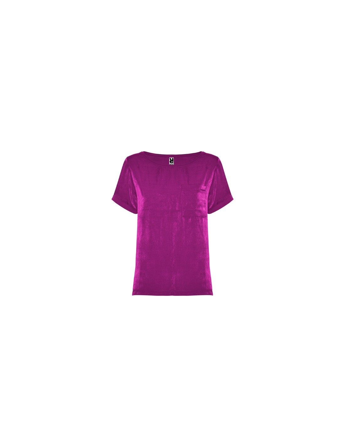 Camiseta de mujer de manga corta y escote amplio. Bolsillo en pecho izquierdo. El patronaje de la espalda es ligeramente más largo que el delantero, con aperturas laterales en el bajo.