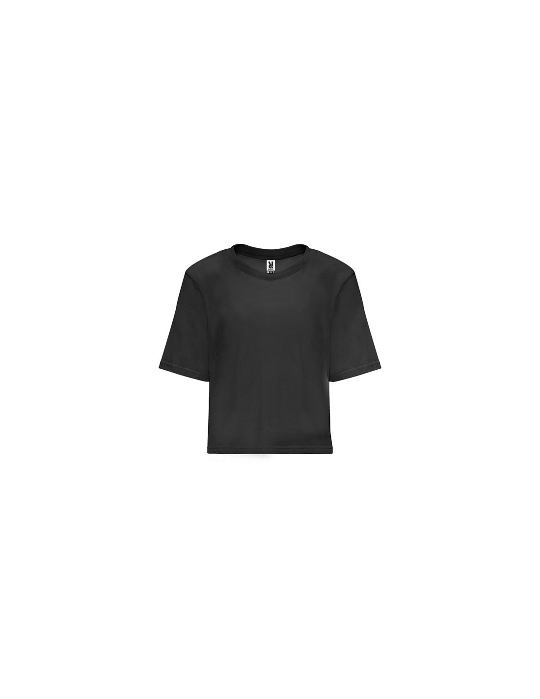Camiseta de talle corto y holgado para mujer con manga corta. Cuello redondo con ribete ancho en canalé 1x1. Cubrecosturas reforzado a tono.
