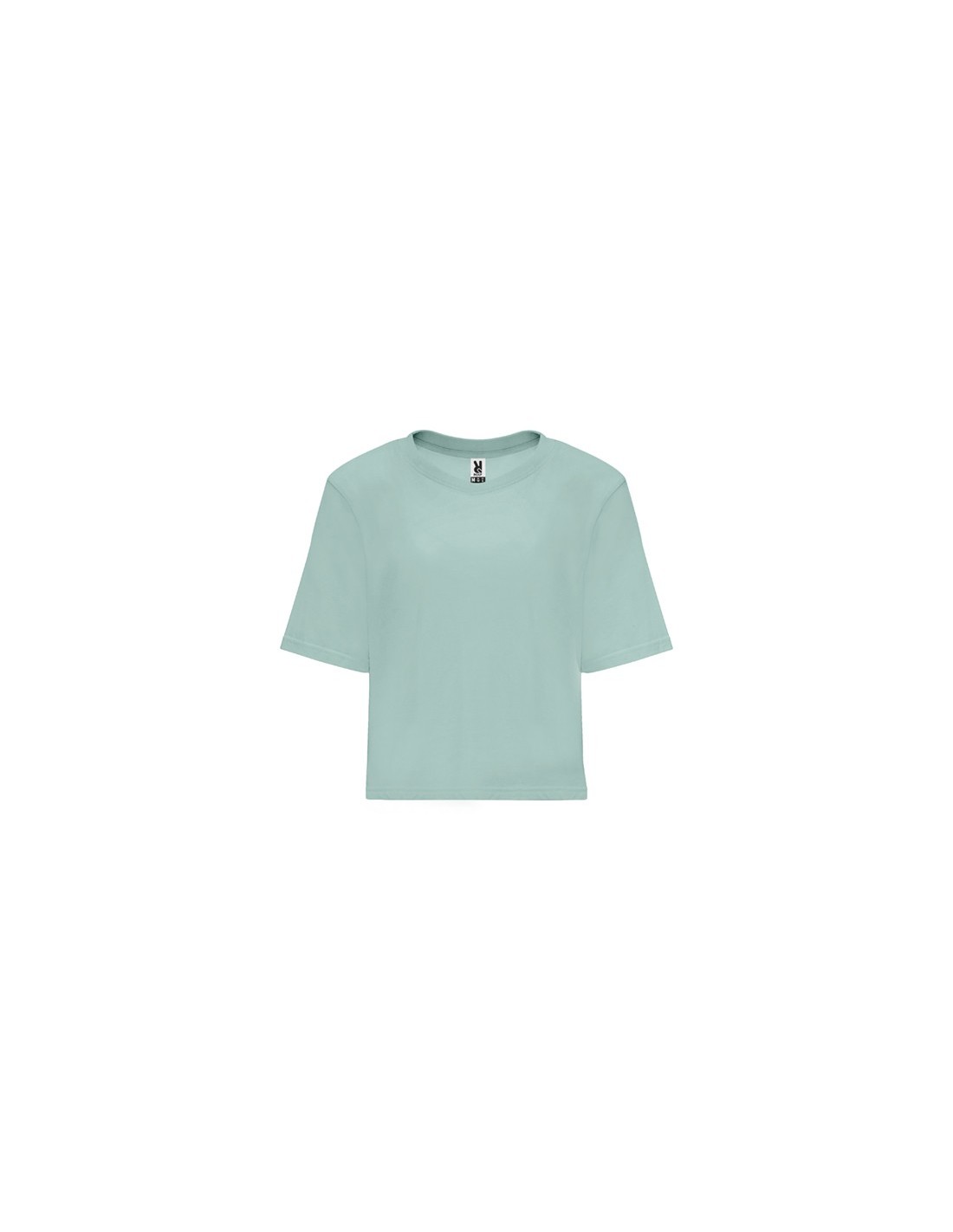 Camiseta de talle corto y holgado para mujer con manga corta. Cuello redondo con ribete ancho en canalé 1x1. Cubrecosturas reforzado a tono.