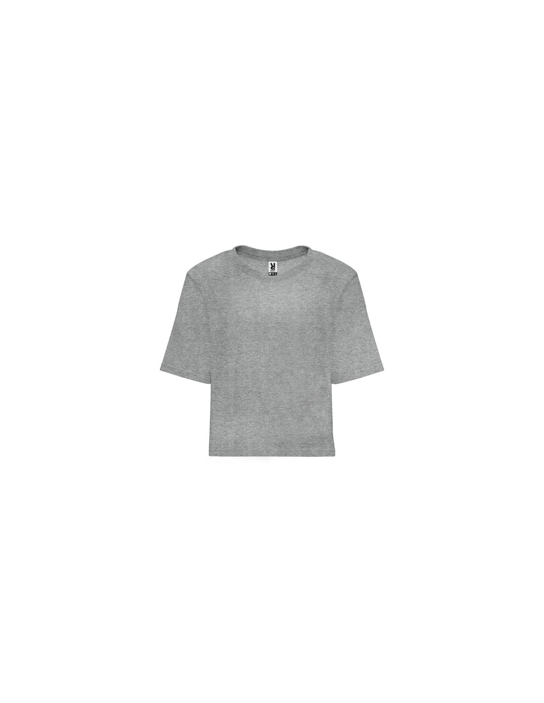 Camiseta de talle corto y holgado para mujer con manga corta. Cuello redondo con ribete ancho en canalé 1x1. Cubrecosturas reforzado a tono.