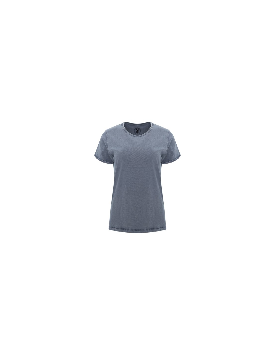 Camiseta de manga corta efecto jeans para mujer. Cuello fino redondo en canalé 1x1 con cubrecosturas de refuerzo de hombro a hombro. Doble costura en sisas. Apertura de manga con dobladillo.