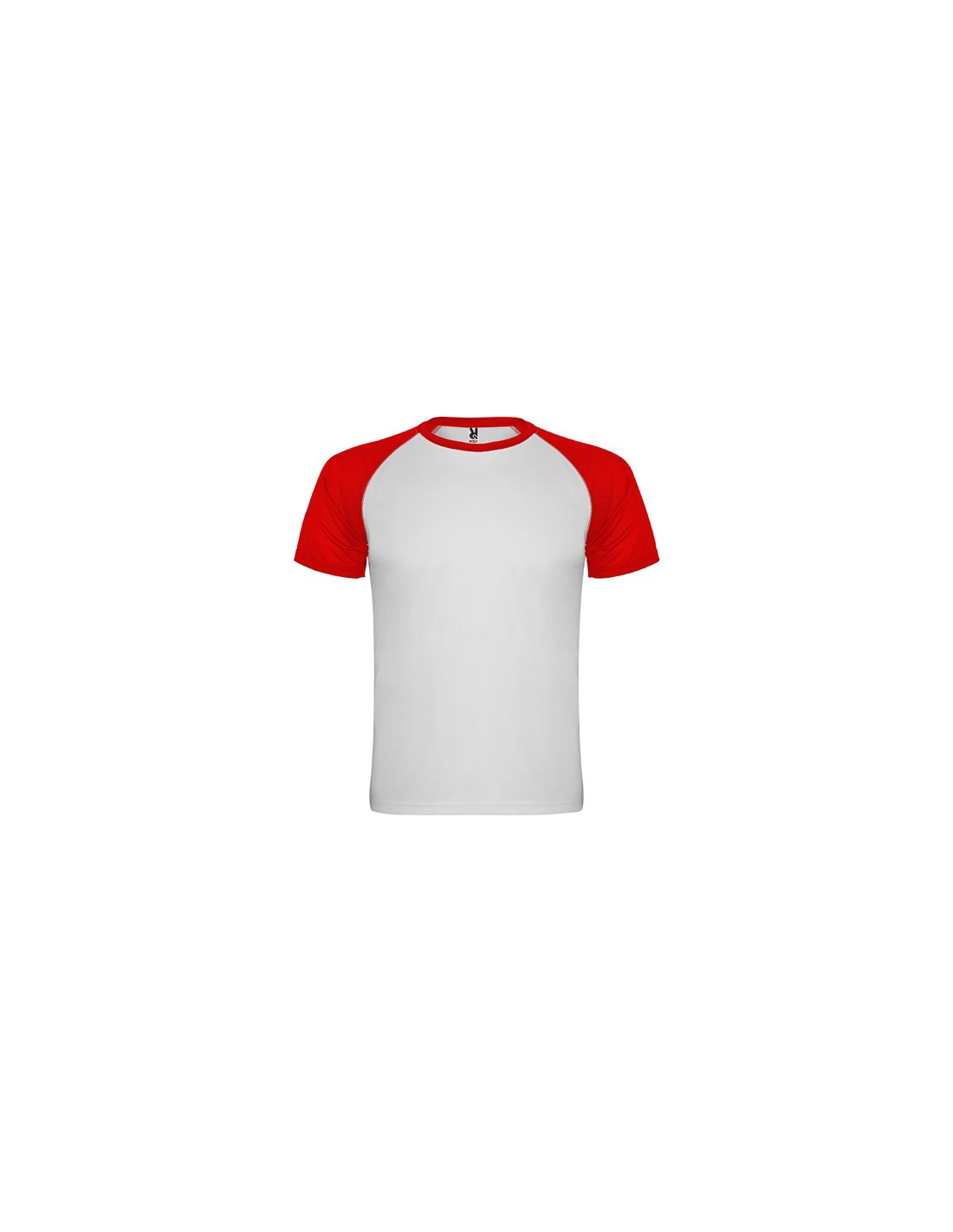 Camiseta deportiva de manga corta estilo ranglan en contraste. Cuello redondo en contraste con cubrecosturas de refuerzo en su interior.