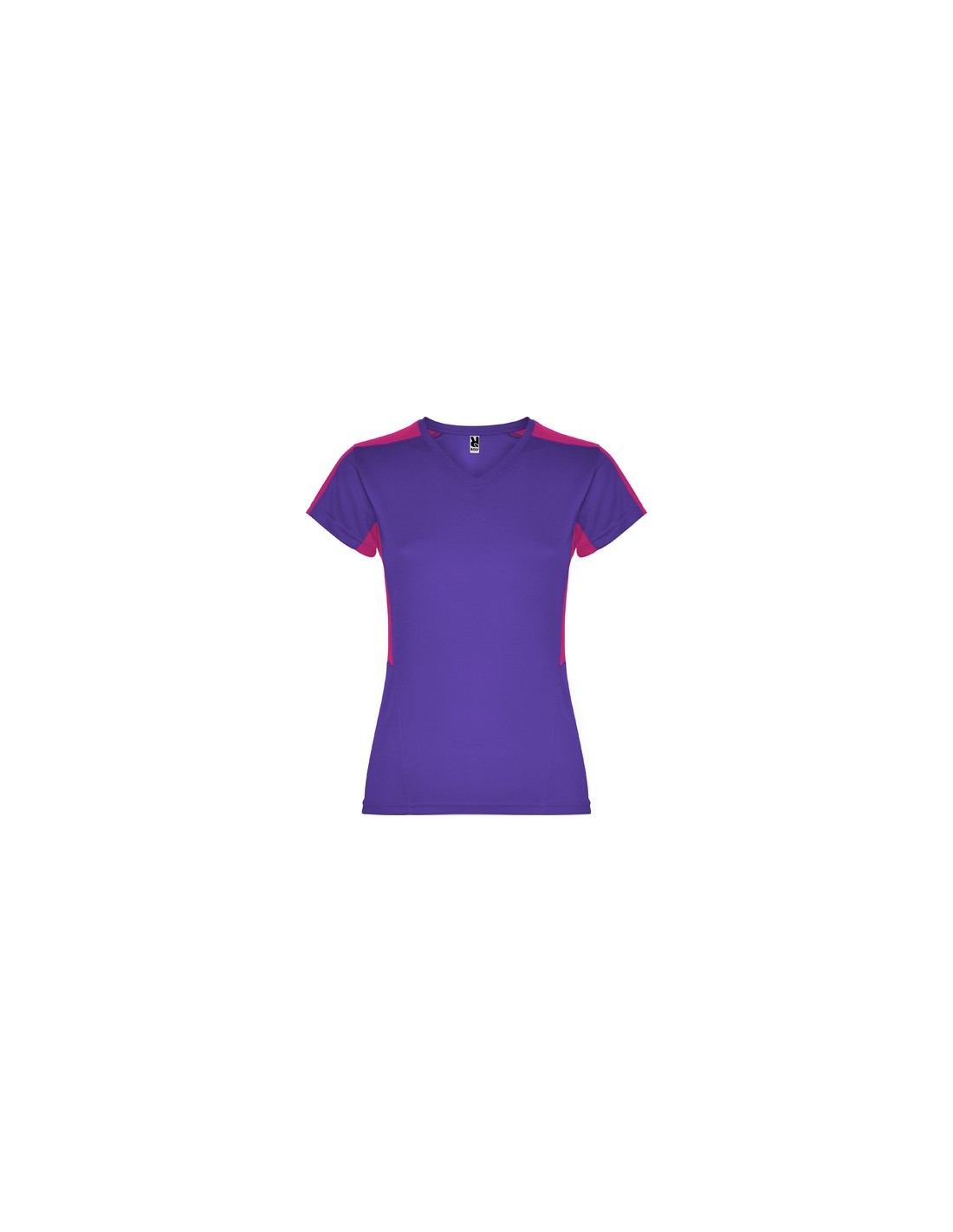Camiseta técnica de manga corta para mujer con cuello pico. Combinada en laterales y hombros con dos tejidos de poliéster. Tejido principal bird´s eye y tejido rejilla 3D transpirable en hombros y paneles laterales. Tejido preparado para la absorción de humedad.