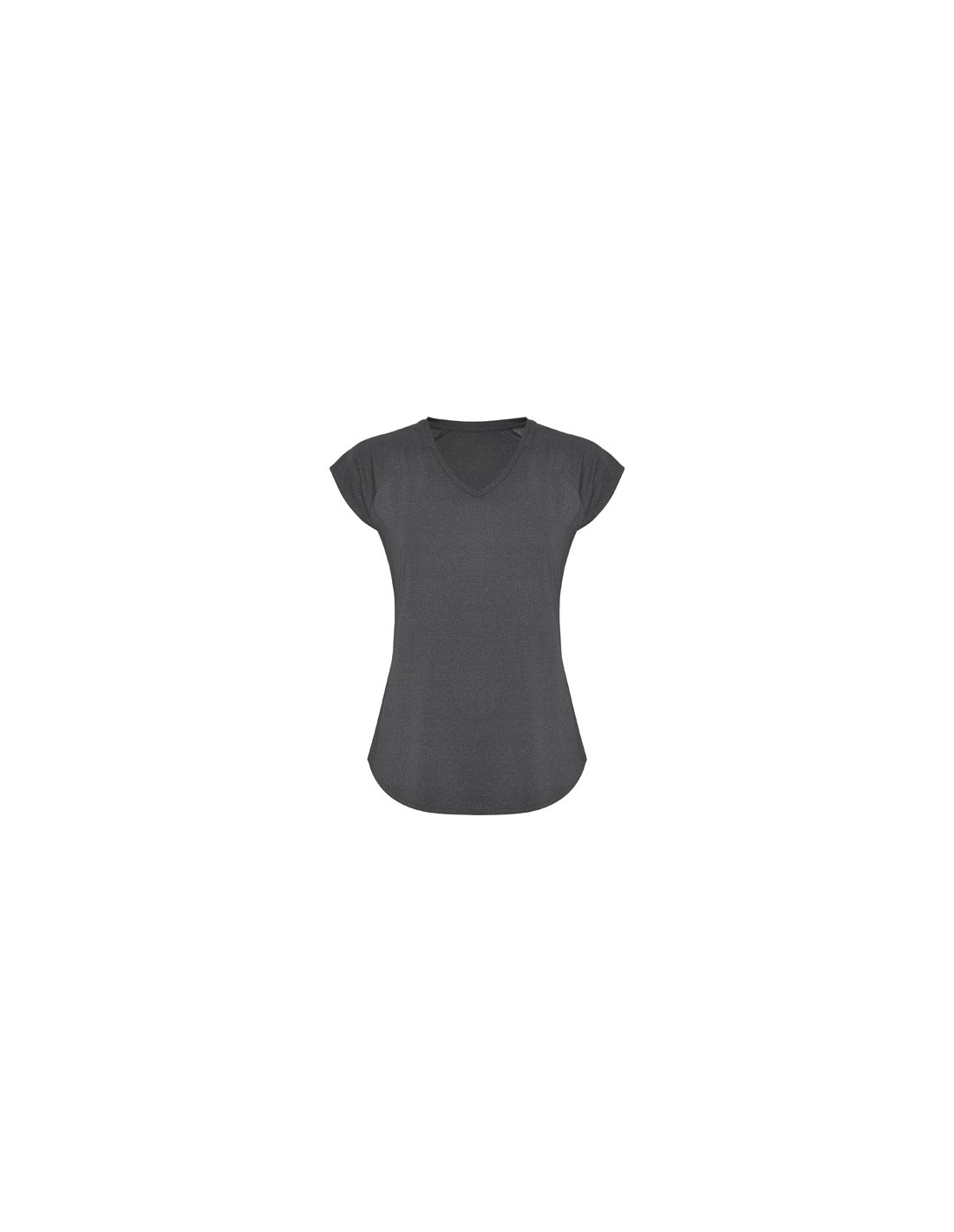 Camiseta técnica multi-deporte de mujer manga corta estilo manga ranglan. Cuello pico. Tejido poliéster con tacto algodón. Corte entallado.