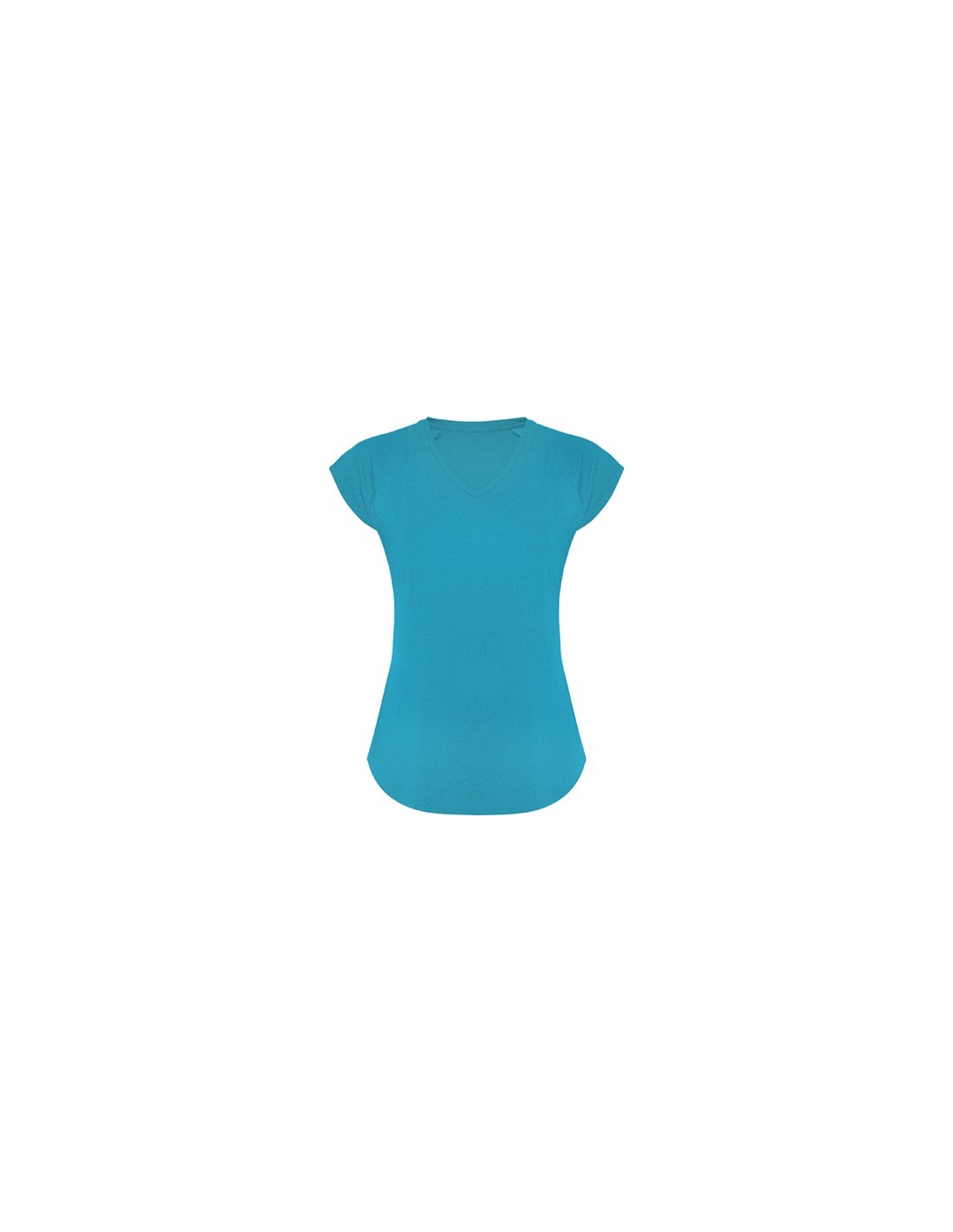 Camiseta técnica multi-deporte de mujer manga corta estilo manga ranglan. Cuello pico. Tejido poliéster con tacto algodón. Corte entallado.