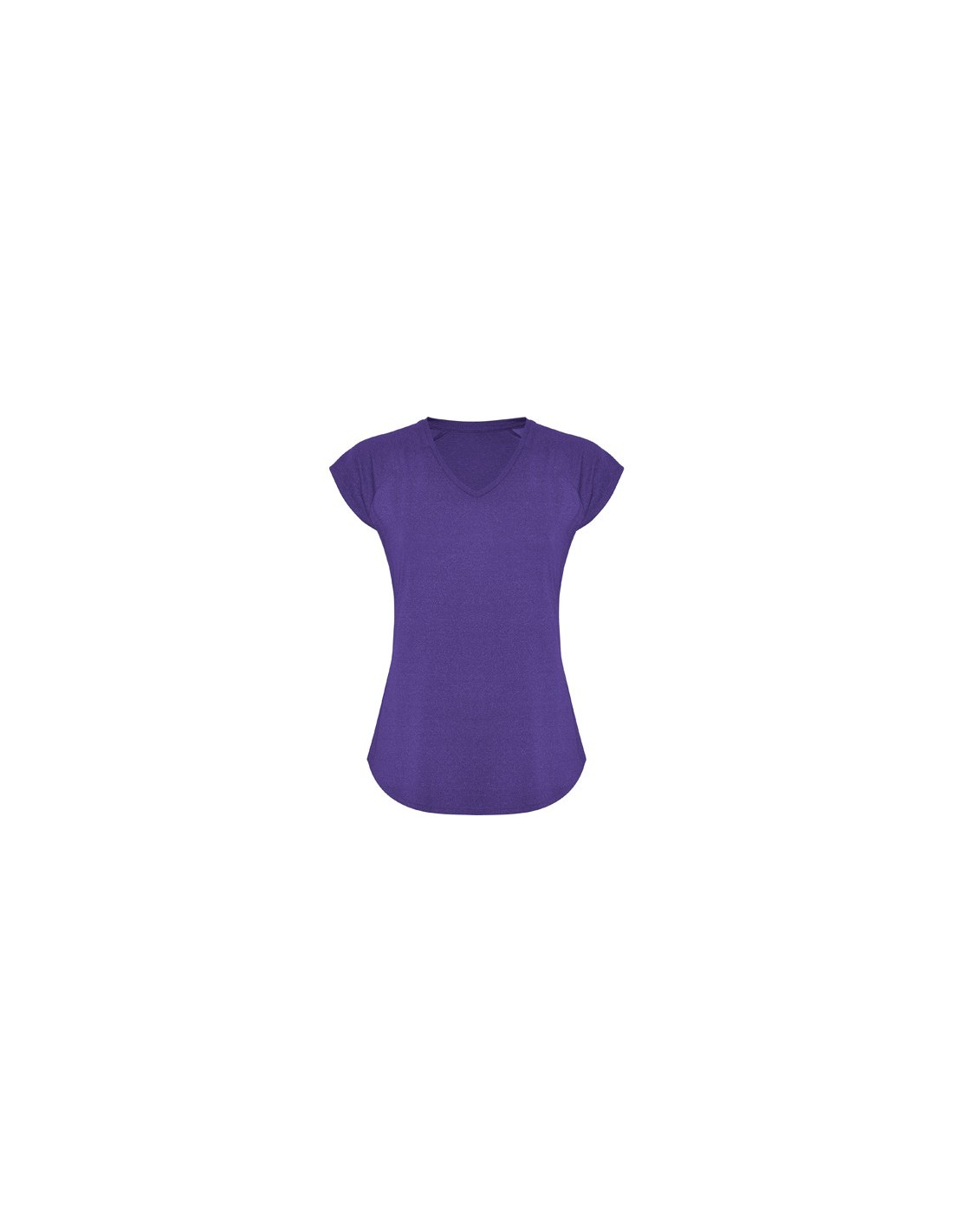 Camiseta técnica multi-deporte de mujer manga corta estilo manga ranglan. Cuello pico. Tejido poliéster con tacto algodón. Corte entallado.