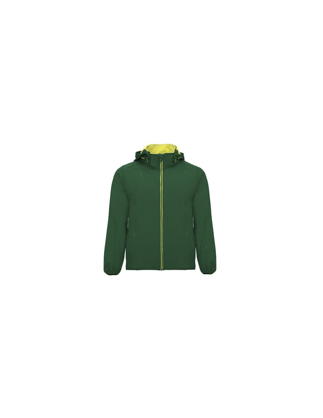 Softshell compuesto de 2 capas con corte deportivo. Cremallera central a contraste con protector de barbilla y tirador. Forro interior en tejido micropolar a contraste. Cuenta con bolsillo exterior en pecho derecho con cremallera invisible con forma diagonal, dos bolsillos exteriores laterales con cremallera invisible, y un bolsillo en manga izquierda. Ribete elástico a tono en puños y bajo. Capucha extraible con forro micropolar a constraste.