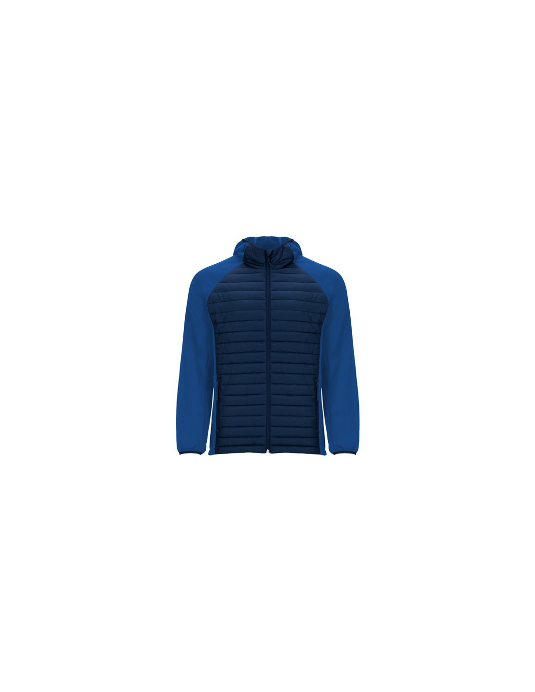 Chaqueta de hombre. Combinada en dos tejidos: ·Capucha fija ajustada. Manga estilo ranglán. Tejido softshell en mangas, paneles laterales y capucha, y tejido acolchado tacto pluma en frontal y espalda. ·Cremallera invertida a tono con protector de barbilla y tirador. ·Dos bolsillos frontales con cremalleras. ·Ribete elástico a tono en cuello, puños y bajo.