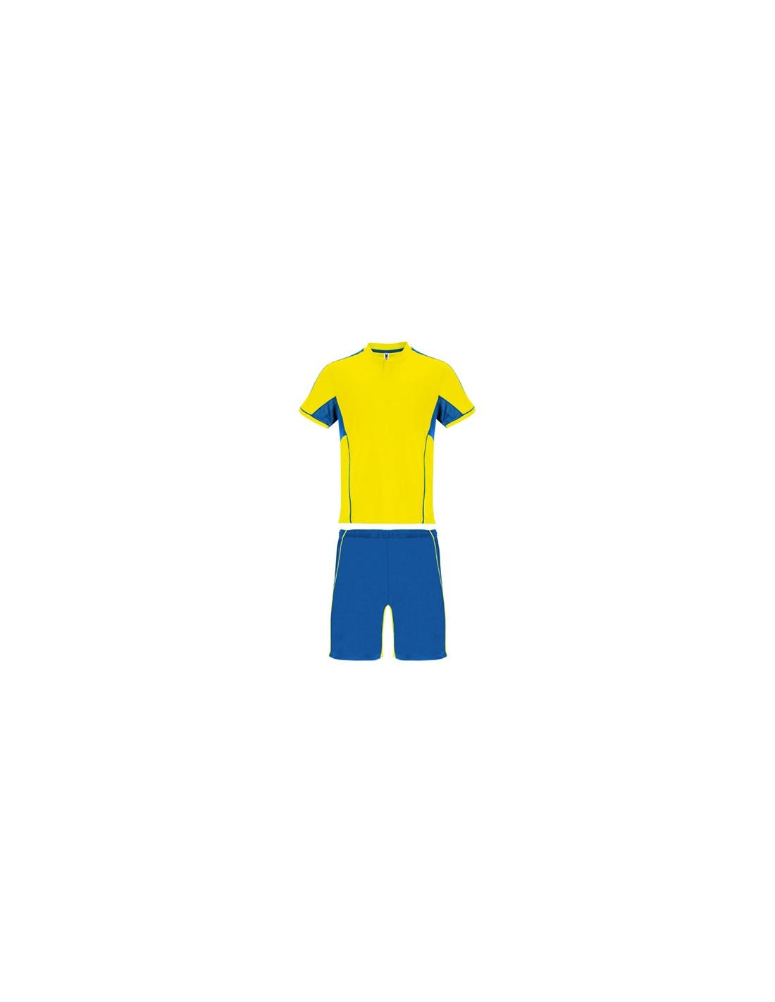 Conjunto deportivo unisex con combinación de tres tejidos: ·Camiseta con cuello mao y apertura mediante broche de presión. ·Interior de la manga en tejido transpirable. ·Paneles laterales y banda superior de manga en tejido control dry. ·Pantalón corto con cinturilla ajustable y cordones. ·Parte interior de la pierna y vivos a contraste en tejido control dry.