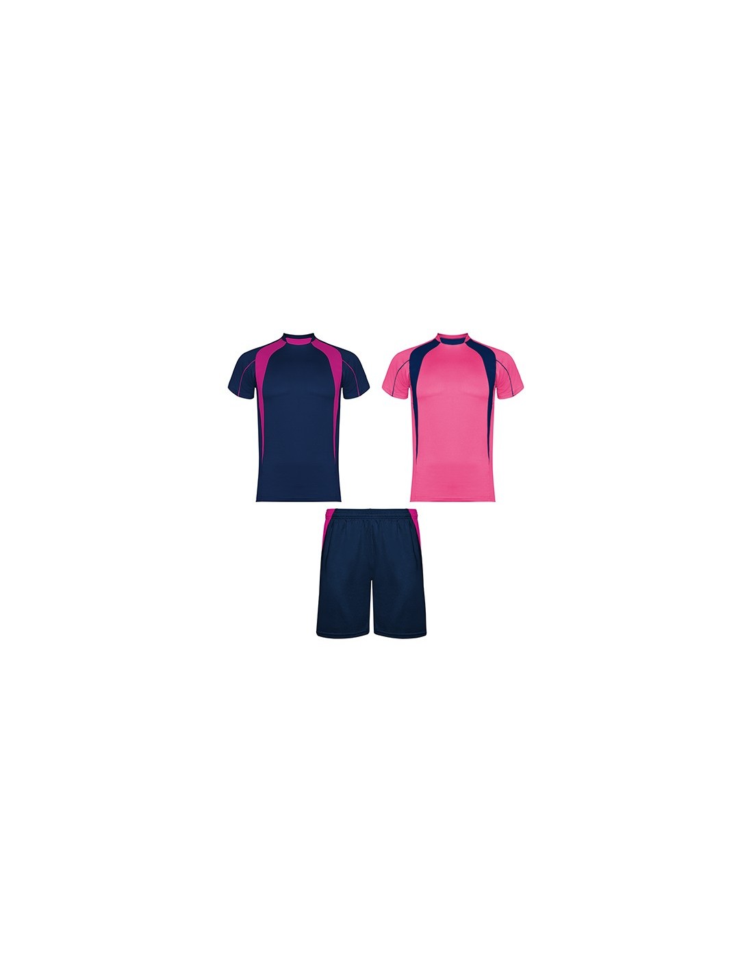 Conjunto deportivo unisex compuesto de 2 camisetas + 1 pantalón. 1.- Inserciones en contraste. 2.- El color de la segunda camiseta se compone de manera contraria.