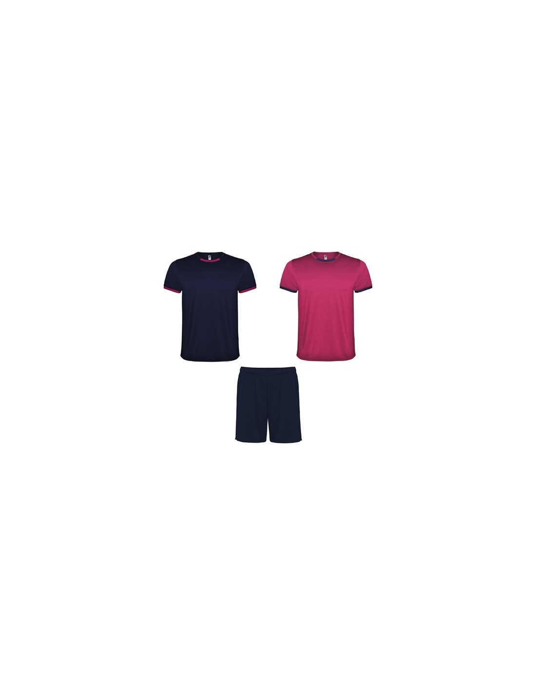 Conjunto deportivo unisex compuesto de 2 camisetas + 1 pantalón. ·Manga corta con vivo ancho en contraste. ·El color de la segunda camiseta se compone de manera contraria. ·Cuello redondo con ribete bicolor y con cubrecosturas reforzado en su interior. ·Pantalón con cinturilla elástica con cordón interior al tono con pespunte de seguridad.