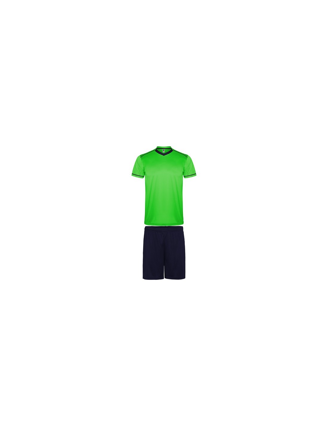 Conjunto deportivo de camiseta y pantalón. ·Camiseta con doble cuello de fantasía con acabado en pico con cubrecosturas reforzado en el interior. ·Hombro con adorno de ribete en contraste. ·Manga corta con apertura acabada en vivo y con ribete de adorno en contraste. ·Pantalón corto con cintura elástica con ajuste de cordón en su interior y pespunte de seguridad.