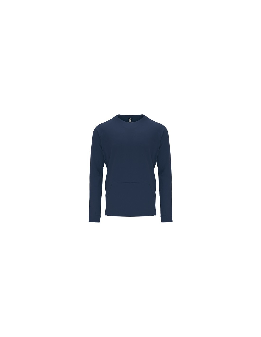 Sudadera de manga larga estilo ranglán. Parte posterior del cuello y parte inferior de los puños en canalé 1x1. Bolsillo canguro con terminación sin costuras. Costuras laterales diagonales hacia parte frontal.