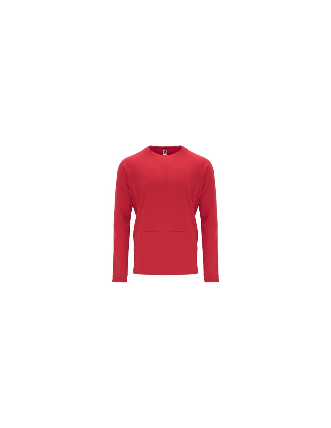 Sudadera de manga larga estilo ranglán. Parte posterior del cuello y parte inferior de los puños en canalé 1x1. Bolsillo canguro con terminación sin costuras. Costuras laterales diagonales hacia parte frontal.