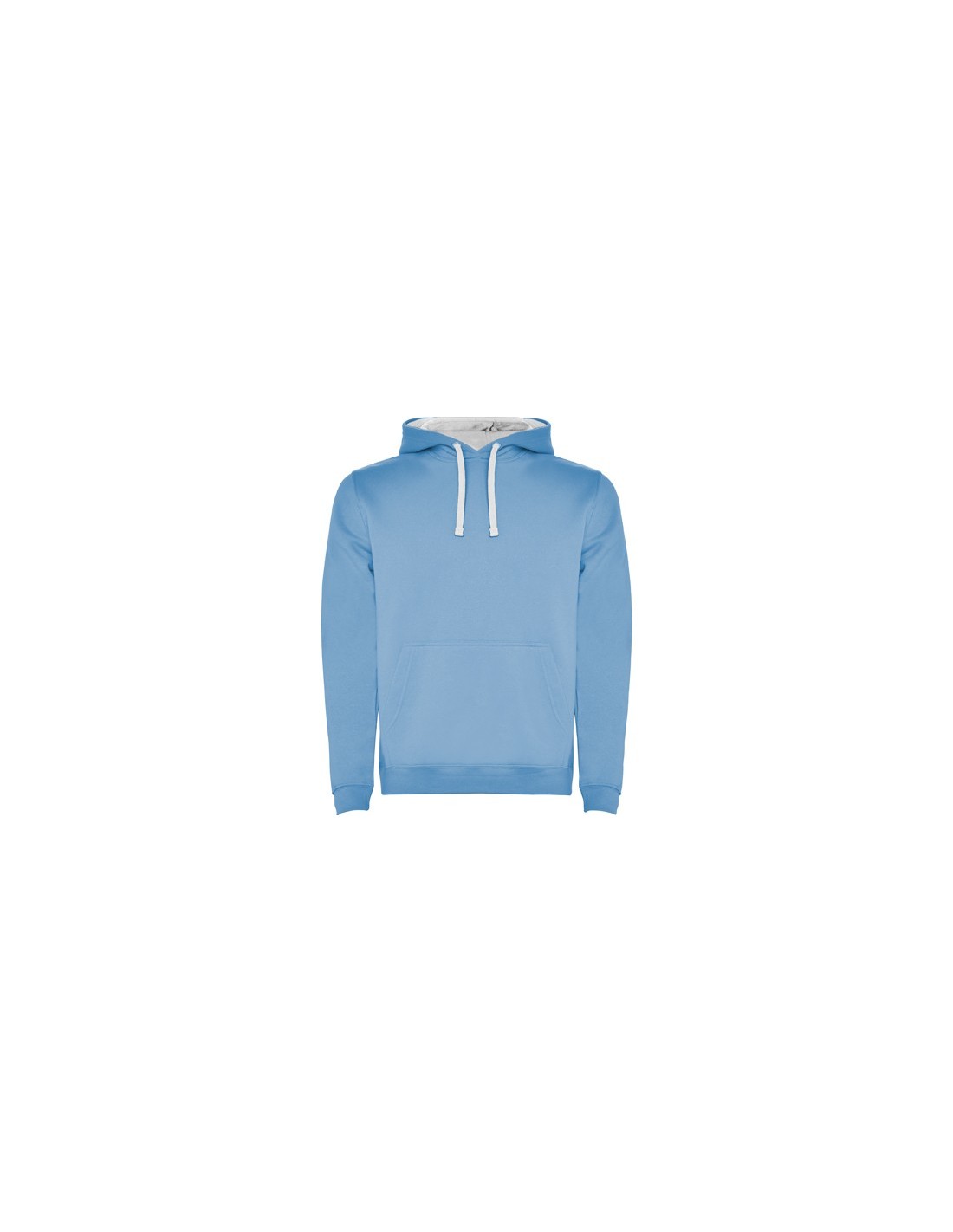 Sudadera con capucha bicolor de doble tejido, con cordón contrastado ajustable, cubrecosturas en el cuello y bolsillo canguro. Punto canalé con elastano 1x1 en puños y cintura. Modelo de niño sin cordón.