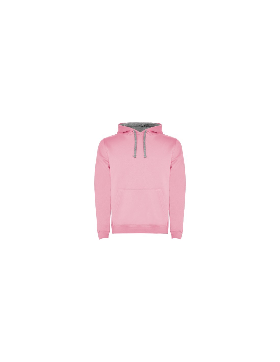 Sudadera con capucha bicolor de doble tejido, con cordón contrastado ajustable, cubrecosturas en el cuello y bolsillo canguro. Punto canalé con elastano 1x1 en puños y cintura. Modelo de niño sin cordón.