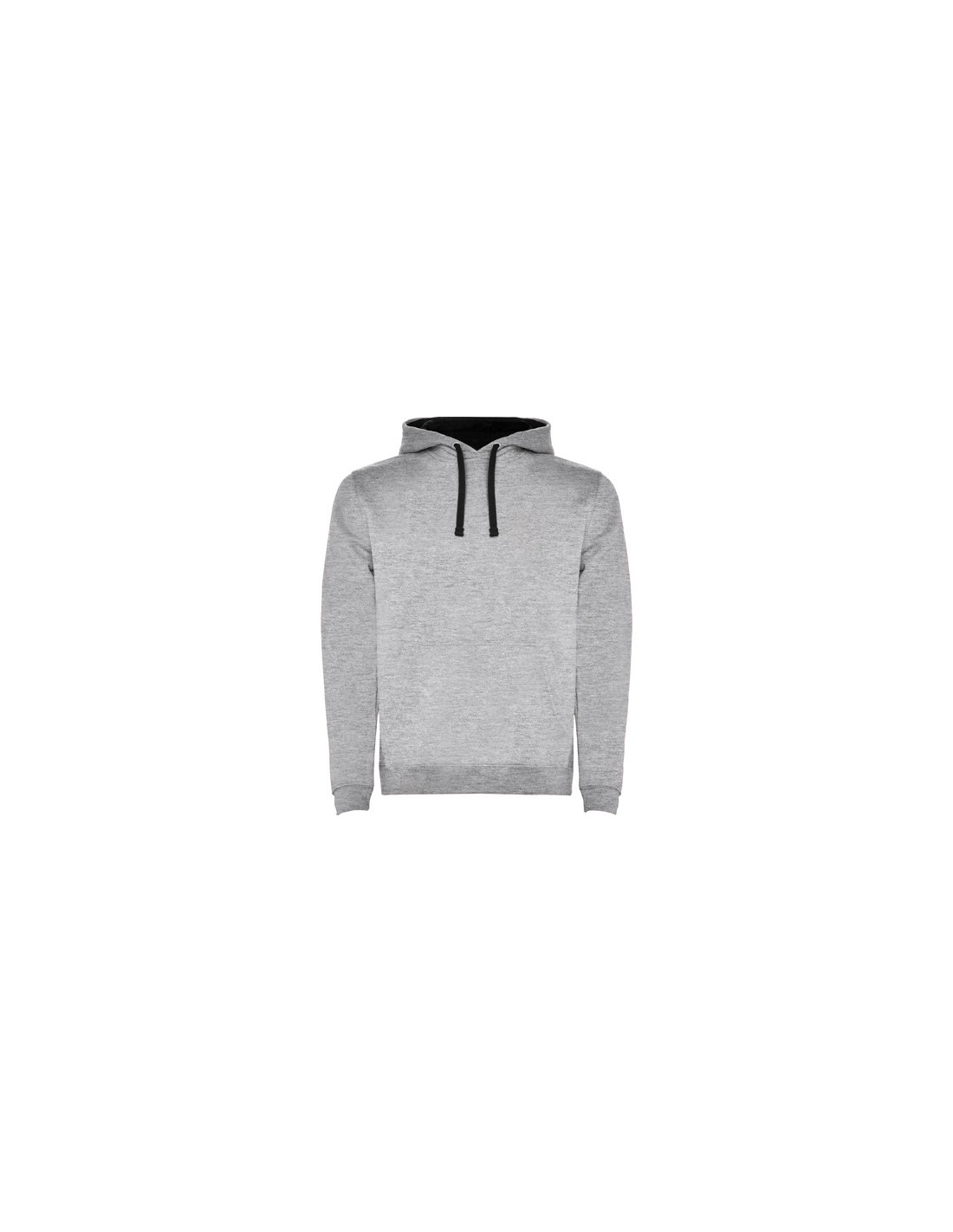 Sudadera con capucha bicolor de doble tejido, con cordón contrastado ajustable, cubrecosturas en el cuello y bolsillo canguro. Punto canalé con elastano 1x1 en puños y cintura. Modelo de niño sin cordón.