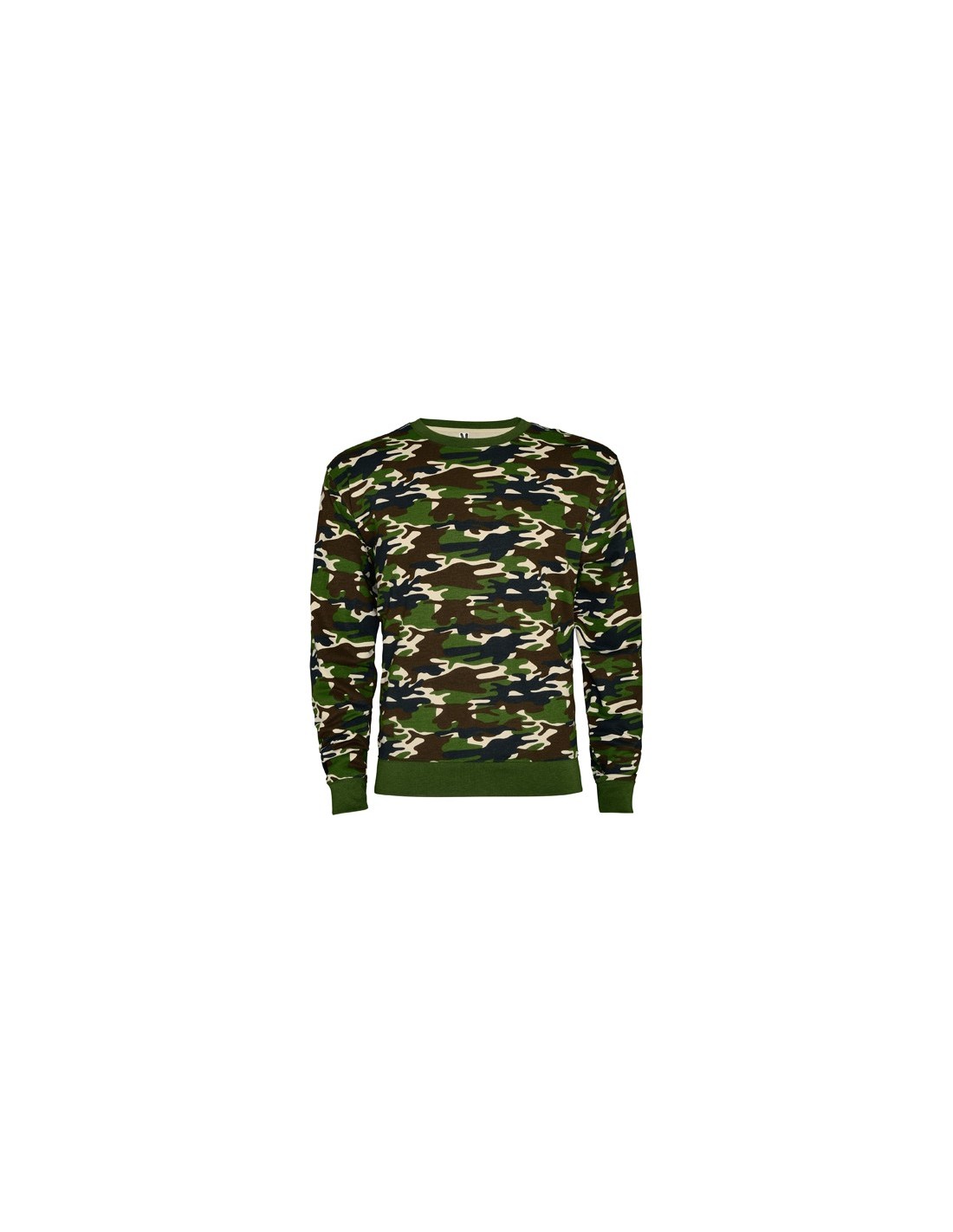 Sudadera estampado camuflaje, cuello a caja con forma redondeada y ribete de canalé. Punto de canalé 1x1 con elastano, en cintura y puños.