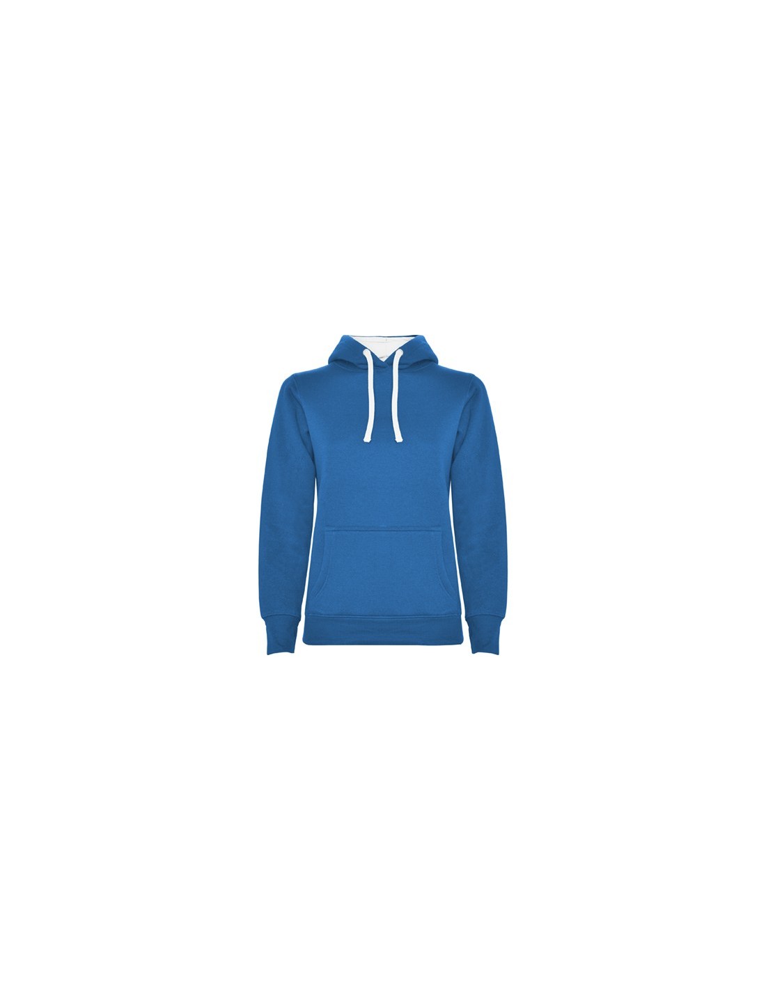 Sudadera entallada de corte femenino con capucha bicolor y bolsillo canguro. 50% algodón / 50% poliéster, 280 g/m².