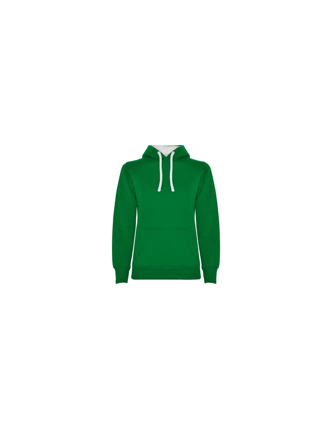 Sudadera entallada de corte femenino con capucha bicolor y bolsillo canguro. 50% algodón / 50% poliéster, 280 g/m².